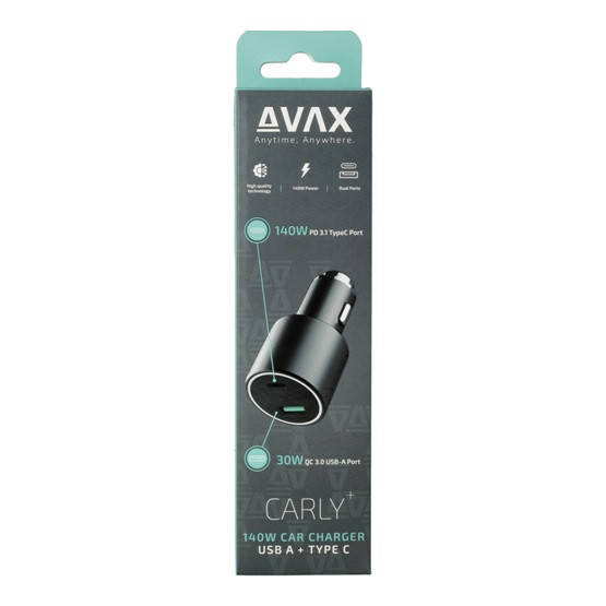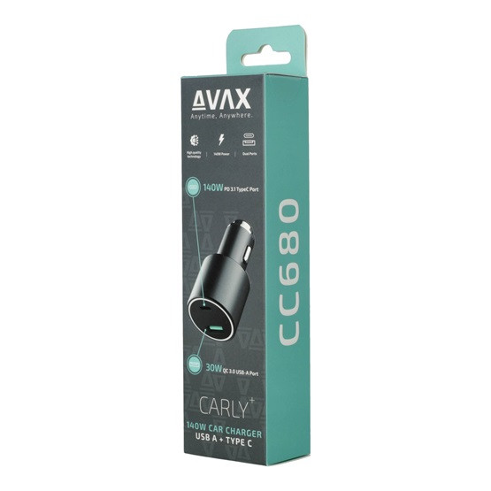 AVAX CC680B CARLY+ USB A + Type C 140W autós töltő, fekete