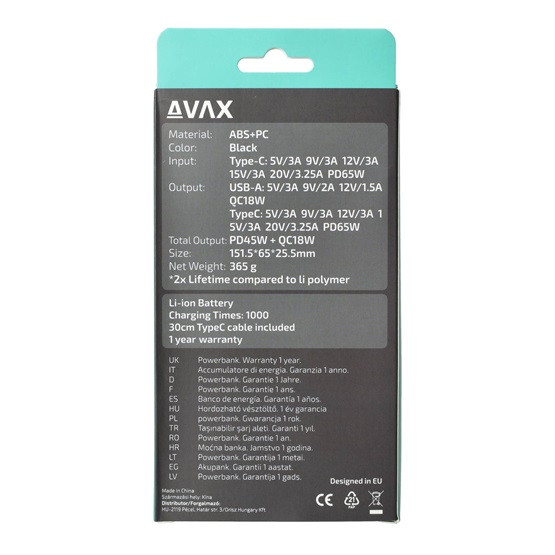 AVAX PB202B VITALITY PD/Type C 65W+QC 18W gyorstöltő Powerbank 20.000mAh, fekete - Dobozsérült termék
